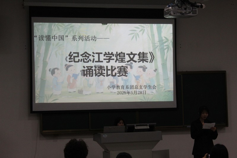 為深切緬懷江學煌先生,傳承其文化精神,小學教育係舉辦了《紀念江學煌文集》誦讀比賽,比賽於5月28日下午在以智樓報告廳舉行。各組選手齊聚一堂,以聲傳情,以誦寄思,為現場觀眾帶來了一場精彩紛呈的文化盛宴。本次比賽邀請到了小教係黨總支副書記胡二慶老師、係團總支書記程蓉蓉老師和李晶晶老師作為本次大賽的評委。