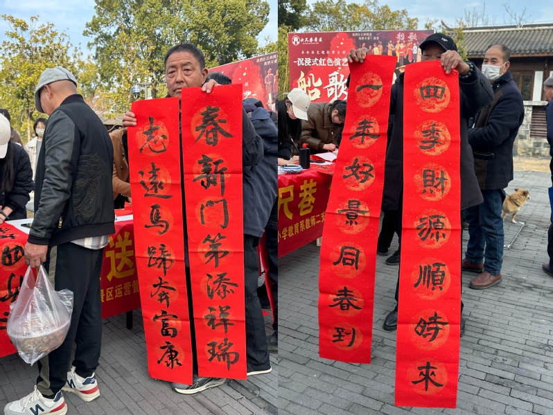 活動現場紅紙鋪展、墨香縈繞。黨員老師與書法協會學生在六尺巷古樸雅致的環境中揮毫書寫,“春風拂柳千山綠,駿馬奔程萬裏紅”“四季財源順時來,一年好景同春到”等一幅幅寓意吉祥的春聯接連誕生。黨員教師和誌願者們積極協助鋪紙、晾聯、分發,並向前來參觀的遊客與周邊居民送上滿載祝福的“福”字與春聯。不少遊客駐足欣賞、拍照留念,更有居民根據自家心願“定製”春聯內容,現場氣氛溫馨熱烈。