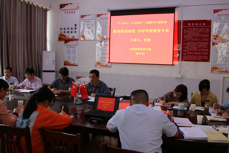 根據學校“不忘初心、牢記使命”主題教育工作安排,10月14日下午,校黨委副書記、校長沈波結合“不忘初心、牢記使命”主題教育的學習、調研體會和思考,聯係學前教育宏觀發展形勢和我校學前教育專業實際,在毓秀樓A(6)會議室作題為“提高政治站位,辦好學前專業”主題教育專題黨課報告。學前教育係全體黨員和非黨員教師代表聆聽了本次黨課。