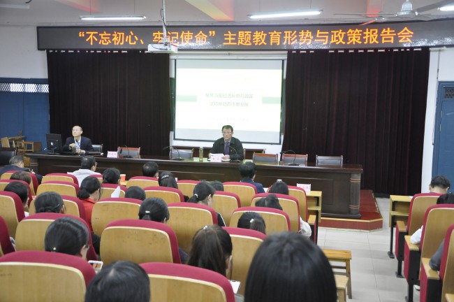 10月21日下午,學校在以智樓報告廳舉辦“不忘初心、牢記使命”主題教育形勢政策專題報告會。中共安慶市委黨校副教授胡建國應邀作《聚焦當前經濟形勢與政策 堅持推動高質量發展》專題報告。校黨委書記朱宏主持。校領導沈波、吳登明、程玉梅、陳發明、王宏偉及全體教職工參加。