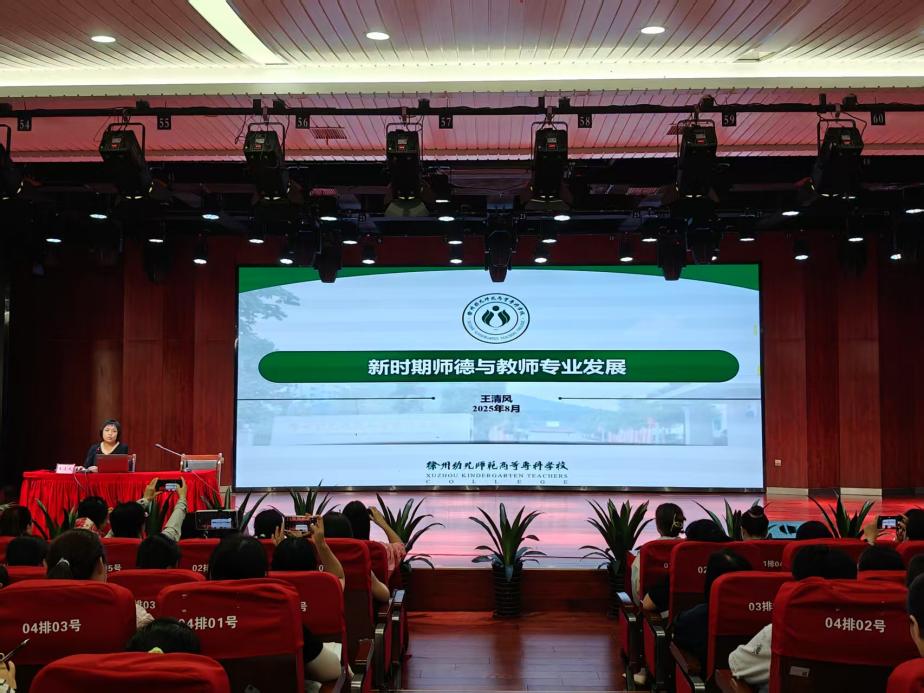 8月19日下午,徐州幼兒師範高等專科學校王清風教授應邀來校,在音樂樓音樂廳為2025年安慶市“安心托幼行動”暨幼兒園教師提升培訓班學員做《新時期幼兒園教師職業道德與教師專業發展》的主題講座。講座由桐城師範高等專科學校學前教育係主任曹杏田主持。