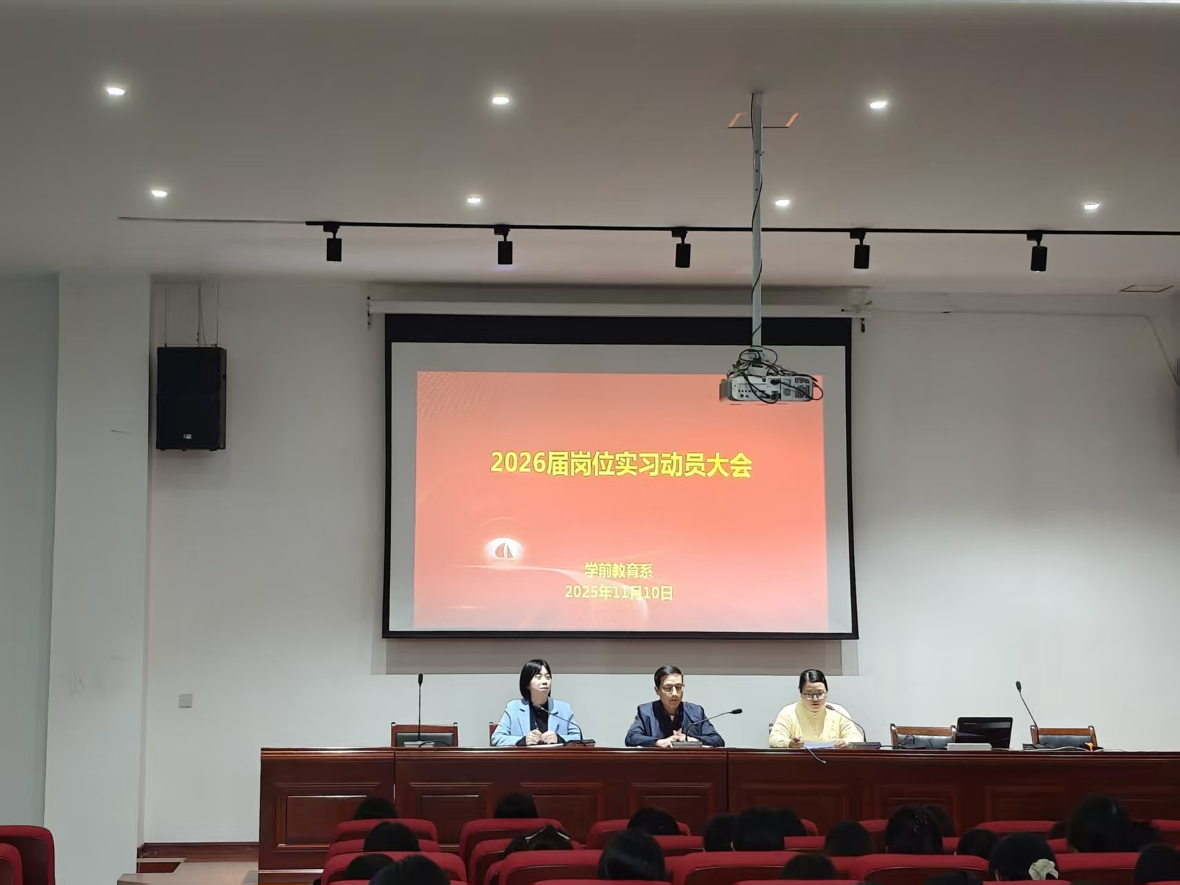 11月10日,學前教育係2026屆崗位實習動員會在其昶樓報告廳分兩批次舉行。學前教育係主任曹杏田、副主任宋曉燕、副書記金丹萍,以及畢業班輔導員、高專23級學前教育專業與早期教育專業全體實習生參加會議。