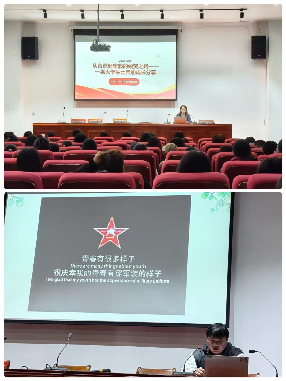 為厚植青年學生國防情懷,強化責任擔當,同時搭建征兵政策宣講與成長經驗交流平台,學前教育係1029舉辦退役士兵分享交流會。我係退役學生蔡麗娜、汪文文攜軍旅淬煉的成長故事重返校園,為同學們帶來一場兼具國防教育意義與參軍動員的分享。