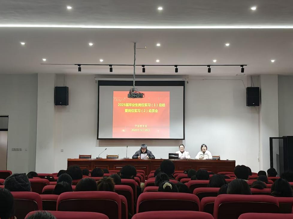 20251229日,學前教育係在其昶樓報告廳召開2026崗位實習總結暨頂崗實習動員大會。係副書記金丹萍、副主任宋曉燕,畢業班輔導員及全體2026屆畢業生參會,會議由宋曉燕主持。