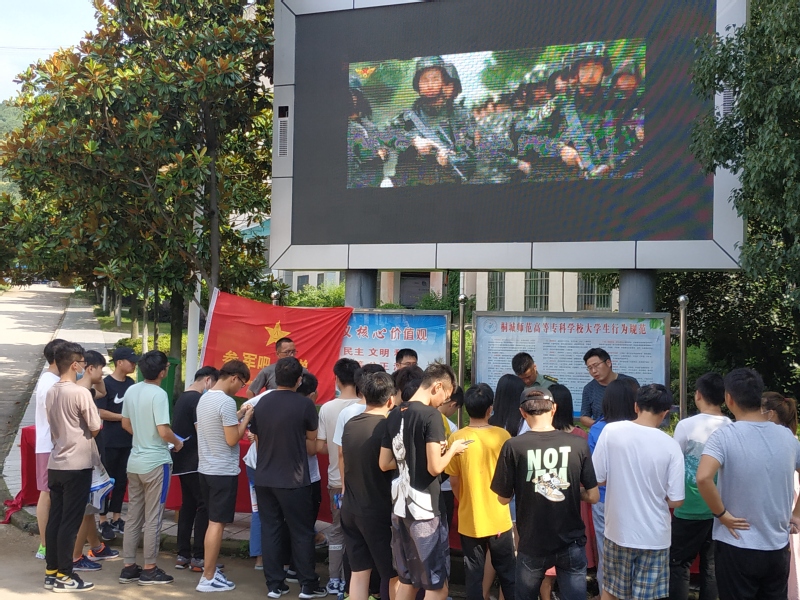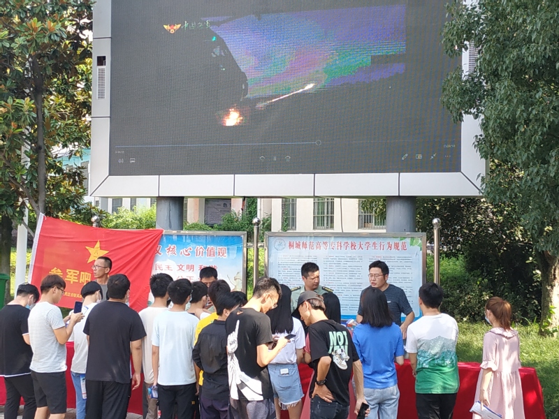 活動現場,通過播放視頻短片、懸掛征兵宣橫幅、發放宣傳冊、擺放展板以及現場答疑等方式,圍繞征兵對象、征集時間、基本程序、優撫政策和體檢注意事項等向廣大學生進行了詳細解答。