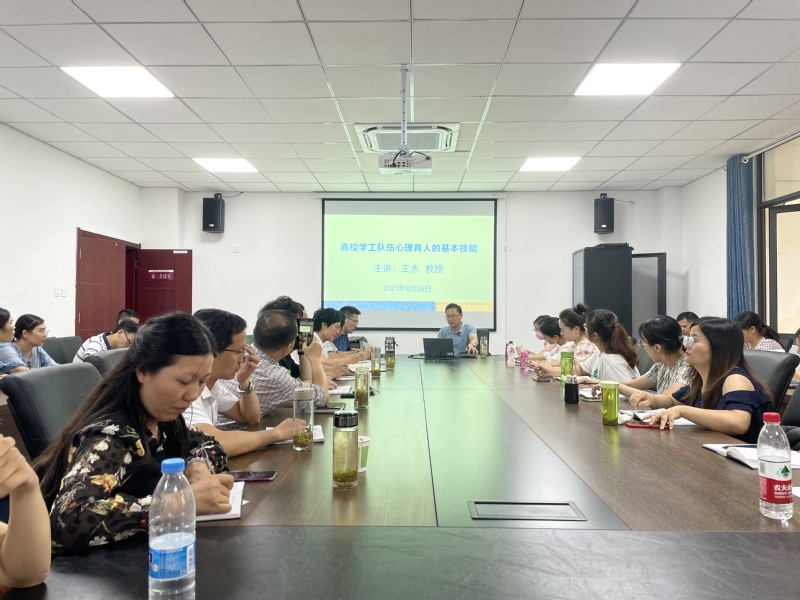 為進一步加強大學生心理健康教育工作,提升我校學工隊伍的心理育人能力,9月3日下午,學校邀請合肥幼兒師範高等專科學校學術委員會副主任、心理學教授王永為我校輔導員講課,副校長程玉梅、學生處全體成員、各係學管主任、學生管理幹事、全體輔導員參加了講座。