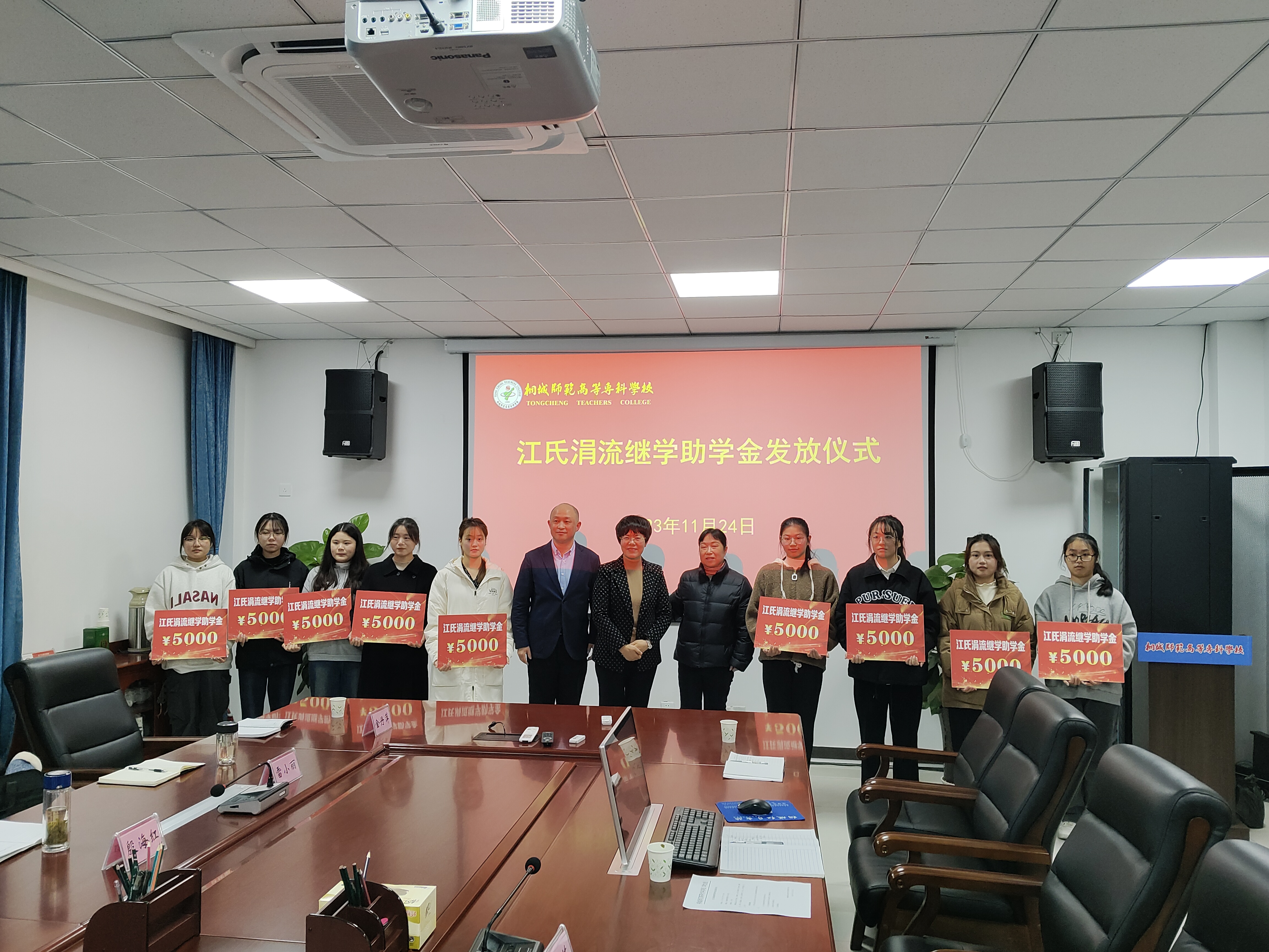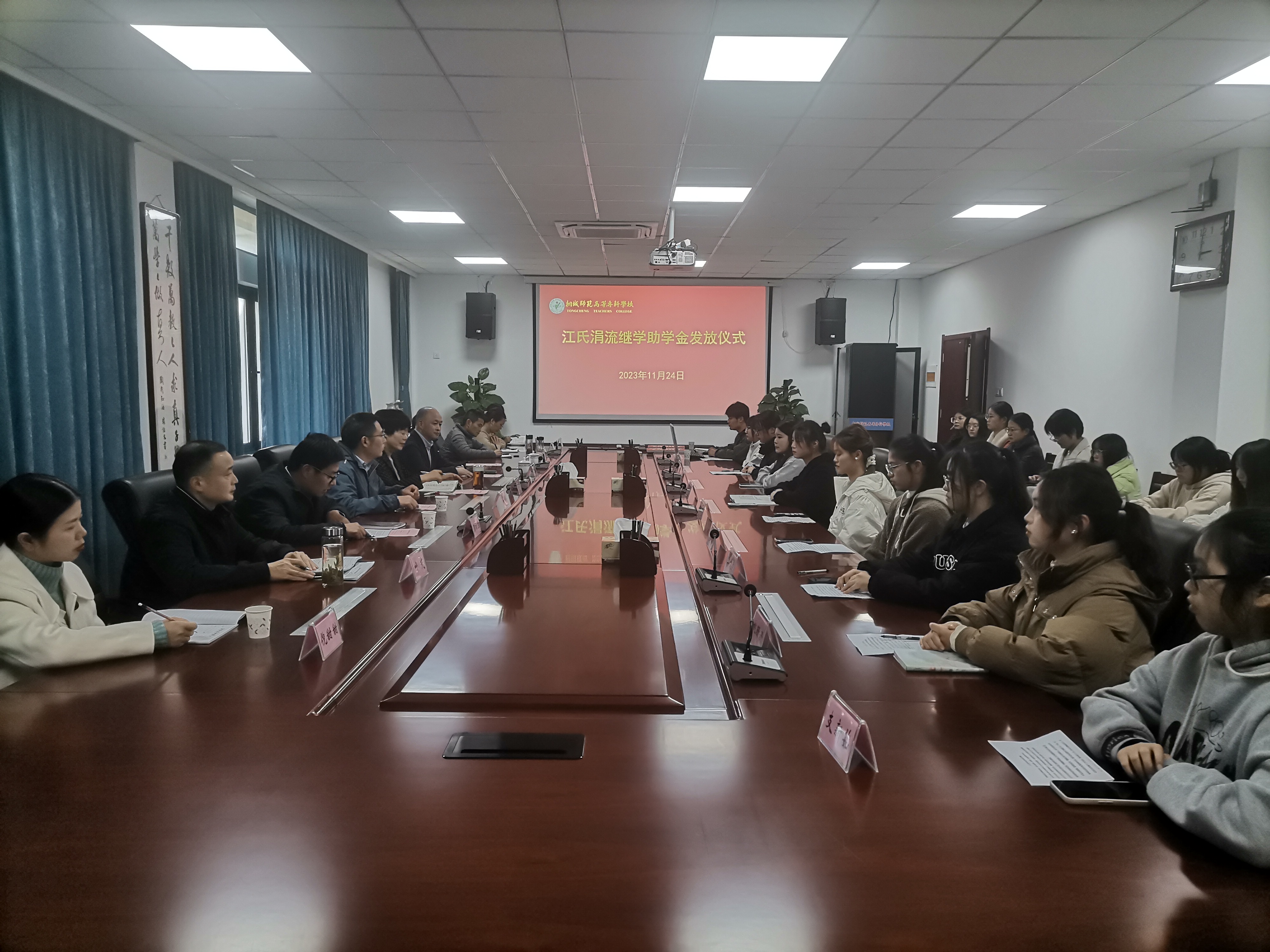 為激勵家庭經濟困難學生勤奮學習,努力進取,德智體美勞全麵發展,11月24日下午,學校在明德樓第六會議室舉行江氏涓流繼學助學金發放儀式。副校長程玉梅,捐資人江海鯤先生、江震梓女士,學生處、各係負責同誌,9名受助學生及15名學生代表參加了發放儀式。