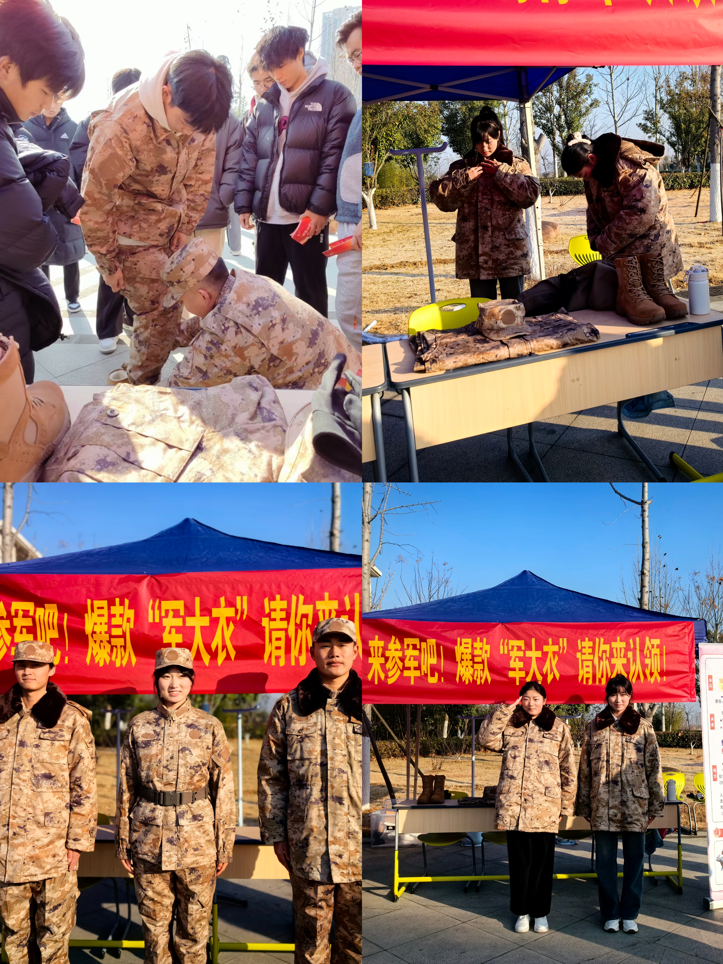 活動現場,通過設置大學生征兵谘詢台、擺放入伍政策宣傳展板、發放宣傳手冊、“軍大衣”體驗等形式,市人武部征兵工作人員身穿軍裝向同學們詳細介紹了大學生入伍的征集流程、報名時間、征集條件和要求、入伍優待政策等相關內容。對於學生提出的報名方式、體檢政考、兵種選擇、專升本、就業優待、學費減免、學籍保留、轉專業、職業發展和未來規劃等方麵逐一進行細致解答,現場氣氛十分熱烈。