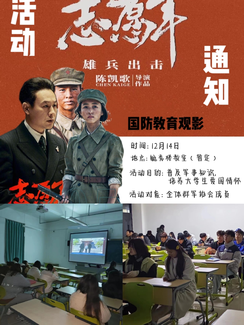 1214日,軍事愛好者協會組織會員觀看愛國電影《誌願者之雄兵出擊》,生動向大學生普及國防知識,培養愛國主義精神和國家榮譽感,增強國家凝聚力和主權意識。