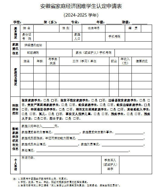 附件2:安徽省家庭經濟困難學生認定申請表.doc