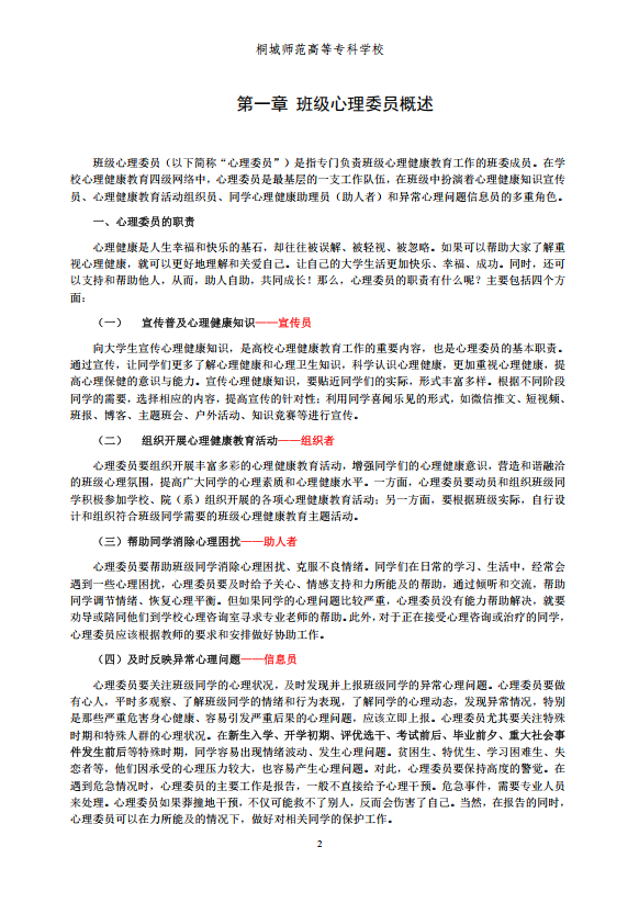 近年來,桐城師專持續加強心理育人體係建設,構建“---”四級網絡工作體係。此次新生心理委員培訓,為切實發揮班級心理委員在工作體係中的“前哨站”作用提供了有力支持,是落實“關口前移、重心下移”心理工作方針的重要舉措,體現了學校對學生心理健康的高度關注與科學應對。未來,學校將持續優化心理委員培養機製,推動朋輩支持力量專業化發展,為學生健康成長織密防護網絡。