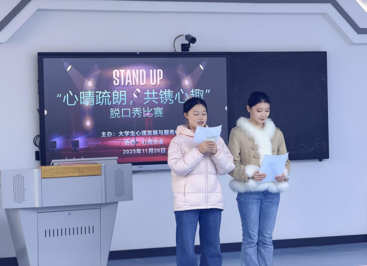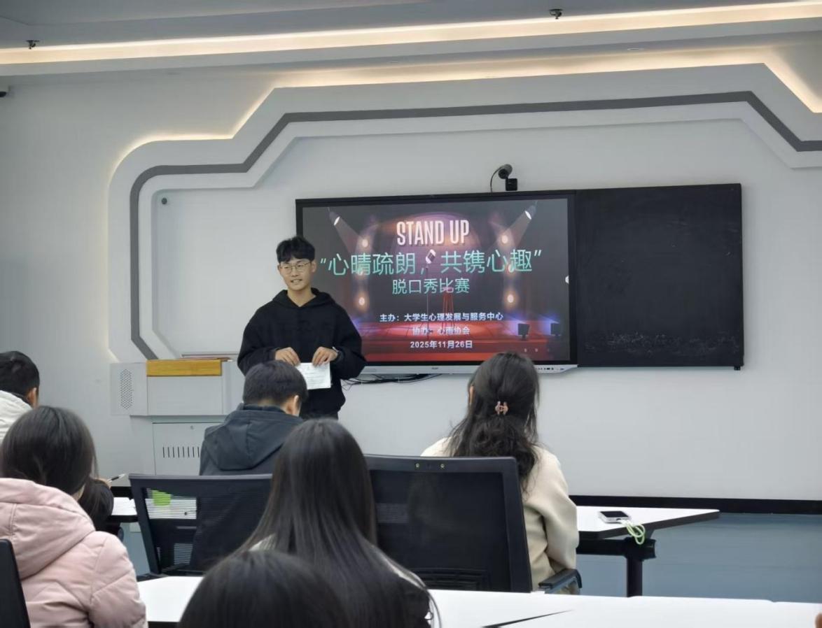 11月26日下午,由大學生心理發展與服務中心主辦,心雨協會承辦的“心晴疏朗,共鐫心趣”脫口秀比賽在毓秀樓智慧教室舉行。自活動通知發布後,同學們積極報名,踴躍參與,15個作品經過初步篩選進入現場展演環節,為关键词2帶來一陣歡聲笑語。
