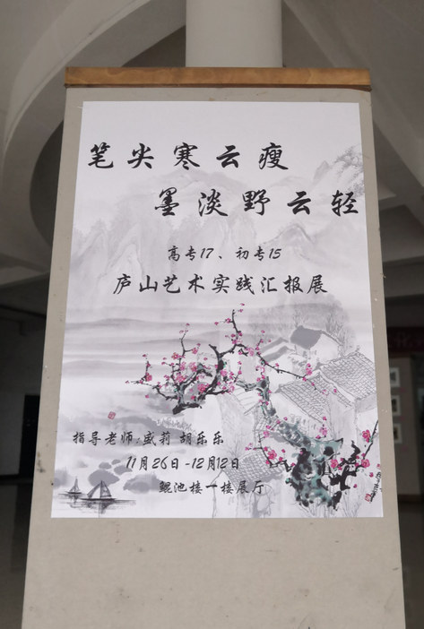 從廬山寫生回來後,我係於11月26日舉辦了以“筆尖寒雲瘦,墨淡野雲輕”為主題的廬山藝術實踐匯報展,地點在鯤池樓一樓大廳,將此次采風寫生的作品展示給廣大師生。