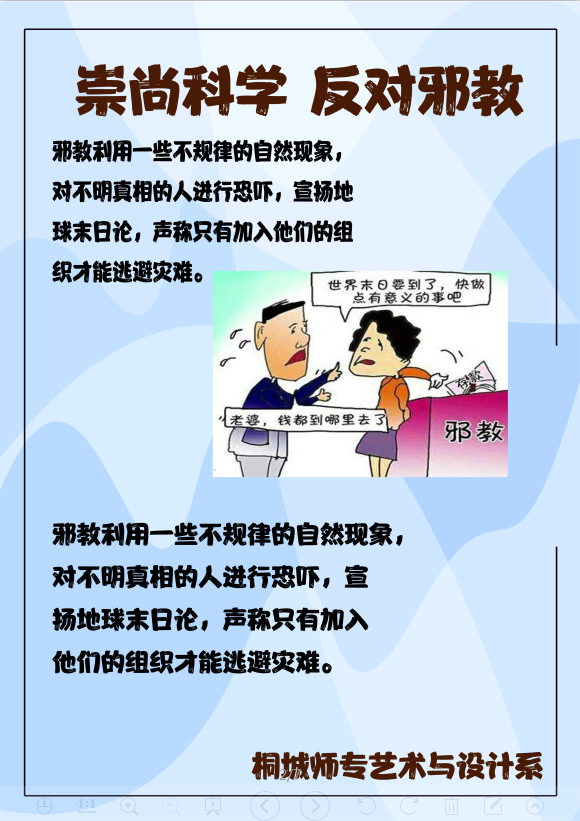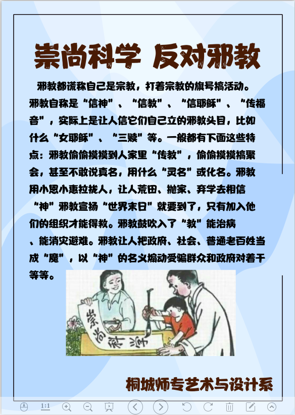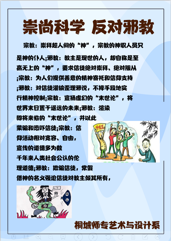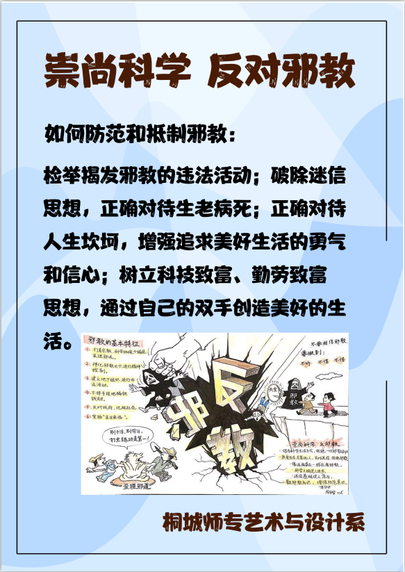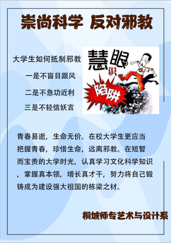 在當今互聯網、自媒體時代,各類邪教組織也在變換形式、翻新手法,以更隱蔽、偽裝的方式向社會各領域滲透,危害人民群眾的身心健康和社會安定。為更好地幫助廣大學生識別邪教,增強反邪教的意識和能力,自覺抵製邪教思想侵蝕,凝聚社會正能量,弘揚科學精神,培育文明、法治、和諧的社會主義核心價值觀,藝術與設計係於2018年11月份開展了“反邪教月”主題教育思政活動 。