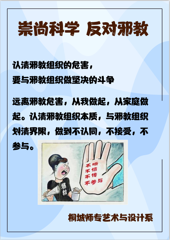 藝術與設計係團總支、學生會還通過藝術與設計係微信公眾號、微博、QQ空間等新媒體推送了名為“向陽而生,拒絕一切邪教活動”等文章,讓大家了解邪教包含哪些教派,以及遇到邪教傳播時該如何應對,同時通過網絡宣傳來呼籲廣大師生群體,相信科學,遠離邪教,共同創造和諧穩定的美好校園。