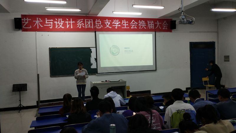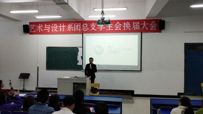 2019年11月17日19:00,藝術與設計係2019-2020學年團總支、學生會換屆大會在鯤池樓多媒體一教室舉行,會議由係學生會副主席薑晨晨主持。藝術與設計係副主任倪甜甜老師、團總支書記程周鵬老師,係團總支、學生會全體成員參加了會議。