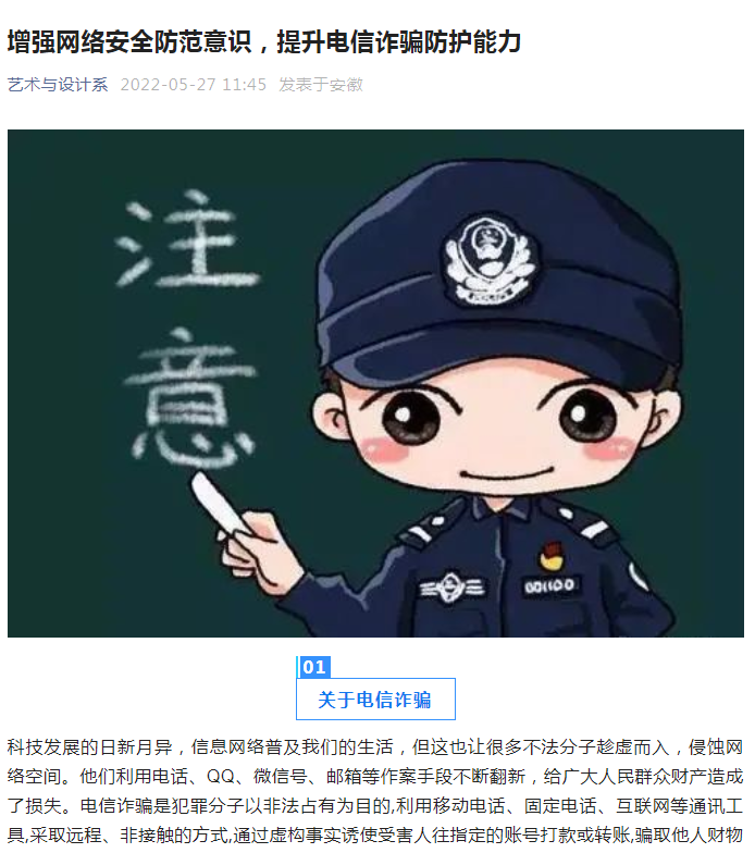 為了更好的營造校園反電詐的氛圍,藝術與設計係於5月27日通過微信公眾號進行線上宣傳。從而提高學生的知曉率,提升防範能力和防範水平。