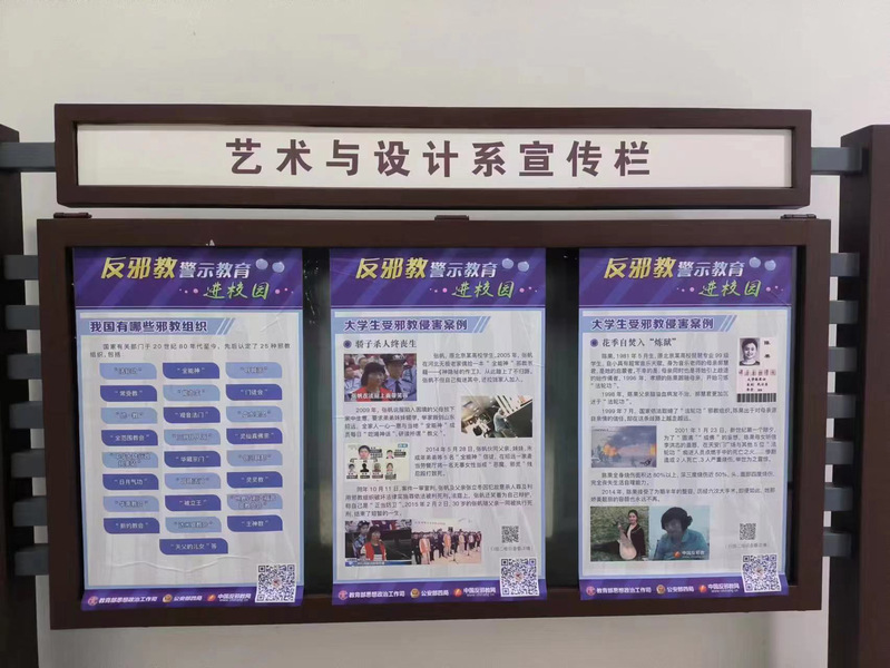 2023年4月14日,在美術南樓門廳舉辦了反邪教警示教育圖片展,向師生們介紹了我國有哪些邪教組織、大學生受邪教侵害案例,通過圖片展提高了師生防範邪教的意識和能力。