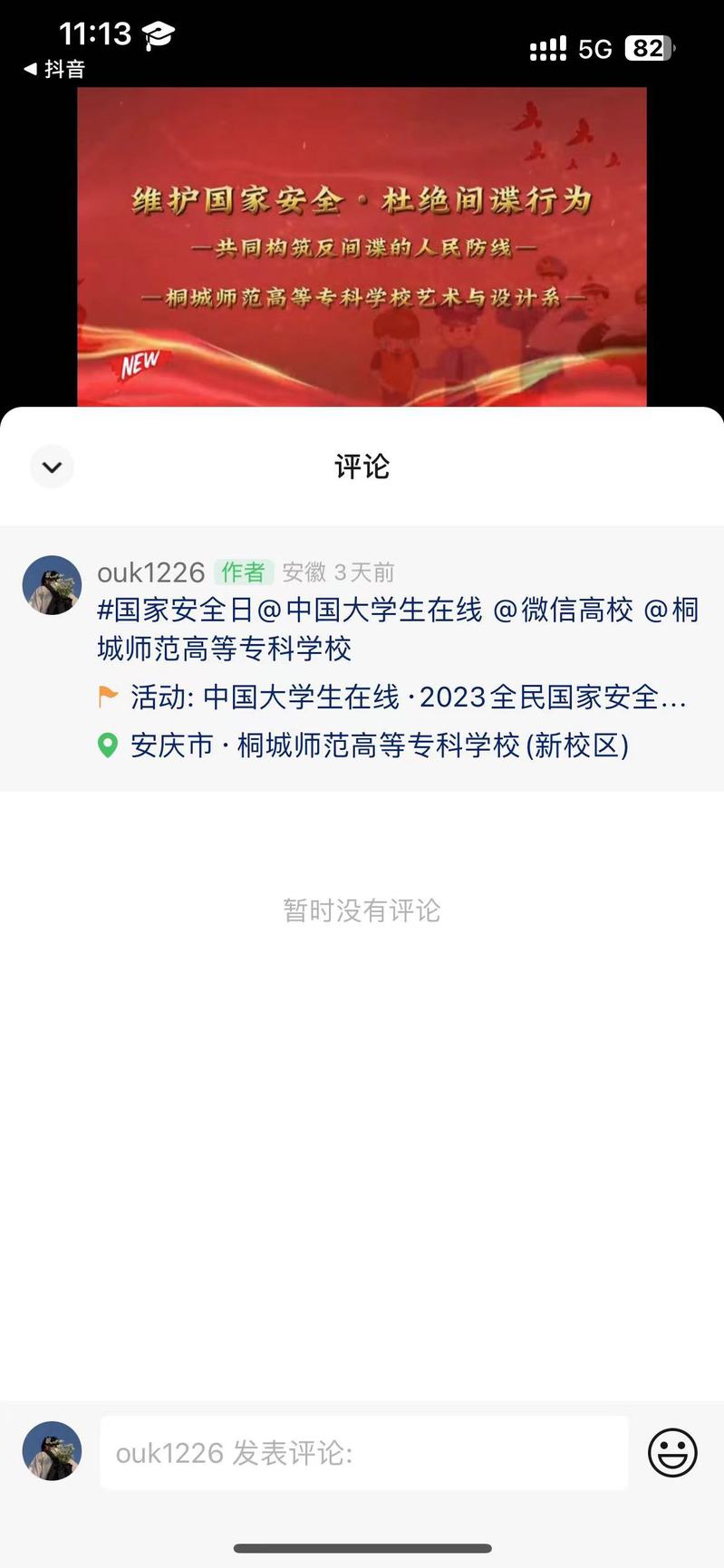 組織學生關注微信視頻號“@中國大學生在線進入“2023 全民國家安全教育活動專題,添加話題#國家安全日,並@中國大學生在線@微信高校@學校官方及師生好友賬號後發布原創主題短視頻,參與話題接力。