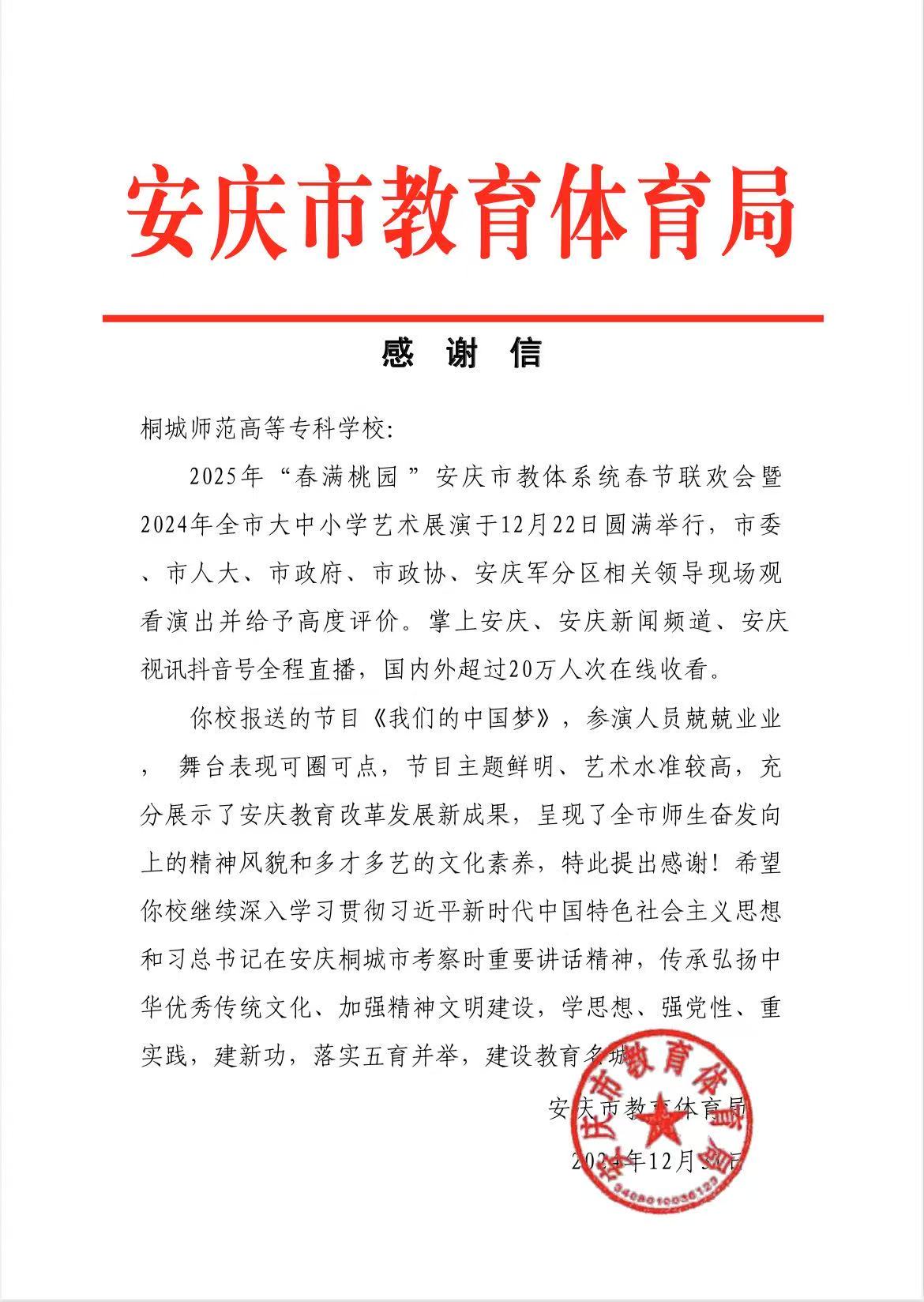 12月31日,安慶市教育體育局向學校發來感謝信,對學校大力支持與配合2024年全市大中小學藝術展演活動的圓滿完成以及學校參演教師的辛勤付出表示感謝。