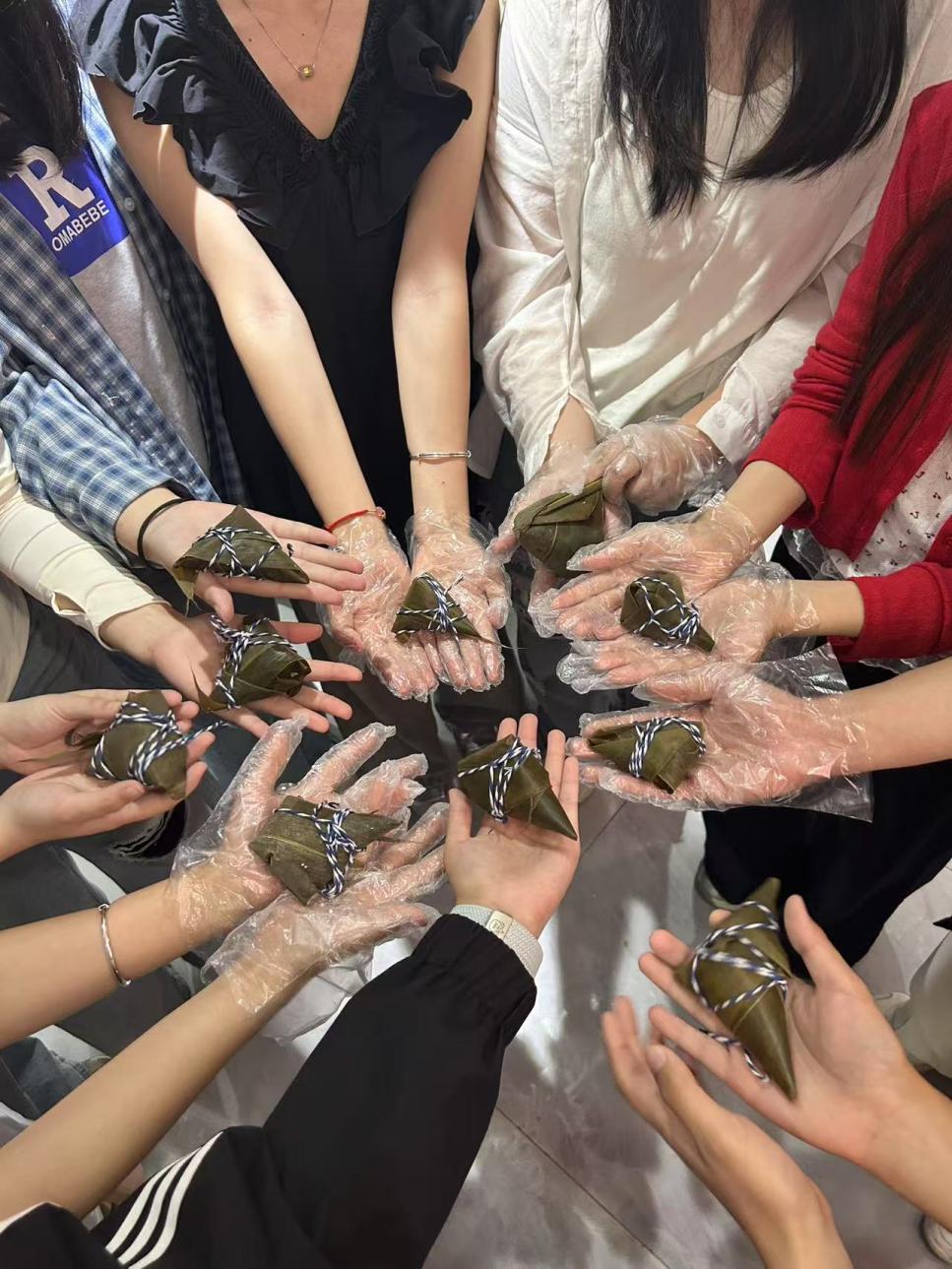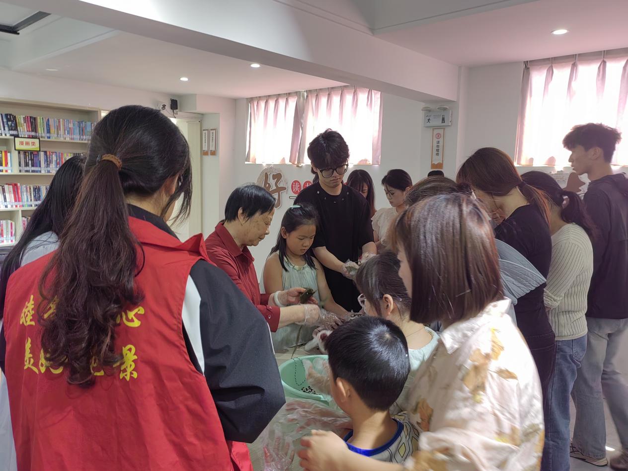 文藝匯演結束後,活動進入手工勞動環節。社區包粽子能手現場示範傳統技藝,詳細講解餡料搭配、粽葉折疊及捆紮技巧。在老師的指導下,學生與居民混合分組,以“老帶新、新促創”的模式共同動手包粽子。現場氛圍熱烈,粽葉翻飛間洋溢著勞動的喜悅與文化傳承的溫情。