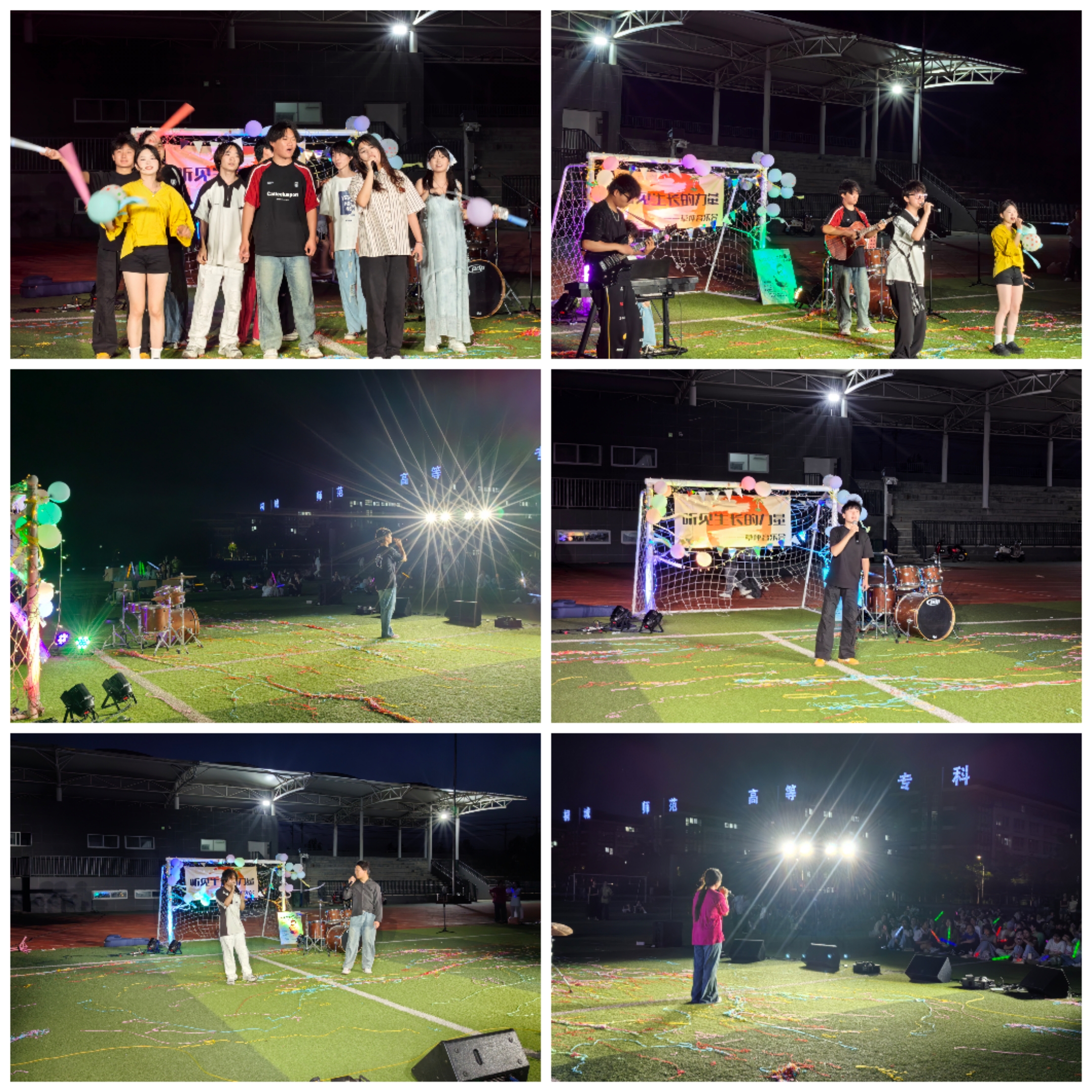 夜幕降臨,繁星點點,布置著彩色串燈與熒光裝飾的草坪化身為青春與治愈的舞台。音樂會在主持人的開場白中拉開序幕,歌曲《風吹麥浪》以細膩的情感與溫柔的嗓音,訴說著成長路上的迷茫與堅定;23音教1班的李天佑演唱的歌曲《我管你》瞬間點燃現場氣氛;一首《瞬》搭配現場輕柔的風與搖曳的燈光,帶領觀眾沉浸於舒緩平和的氛圍;其他同學們各展才華,音樂與歌聲交織成動人的旋律,從激情的說唱到校園民謠,每一首歌都充滿著力量,直擊聽眾的心靈深處。最後,Topping-up樂隊演唱的歌曲《逆戰》,樂隊如驚雷炸響舞台,主唱極具穿透力的嗓音再次將現場點燃,台上台下齊唱。音樂會圓滿結束!