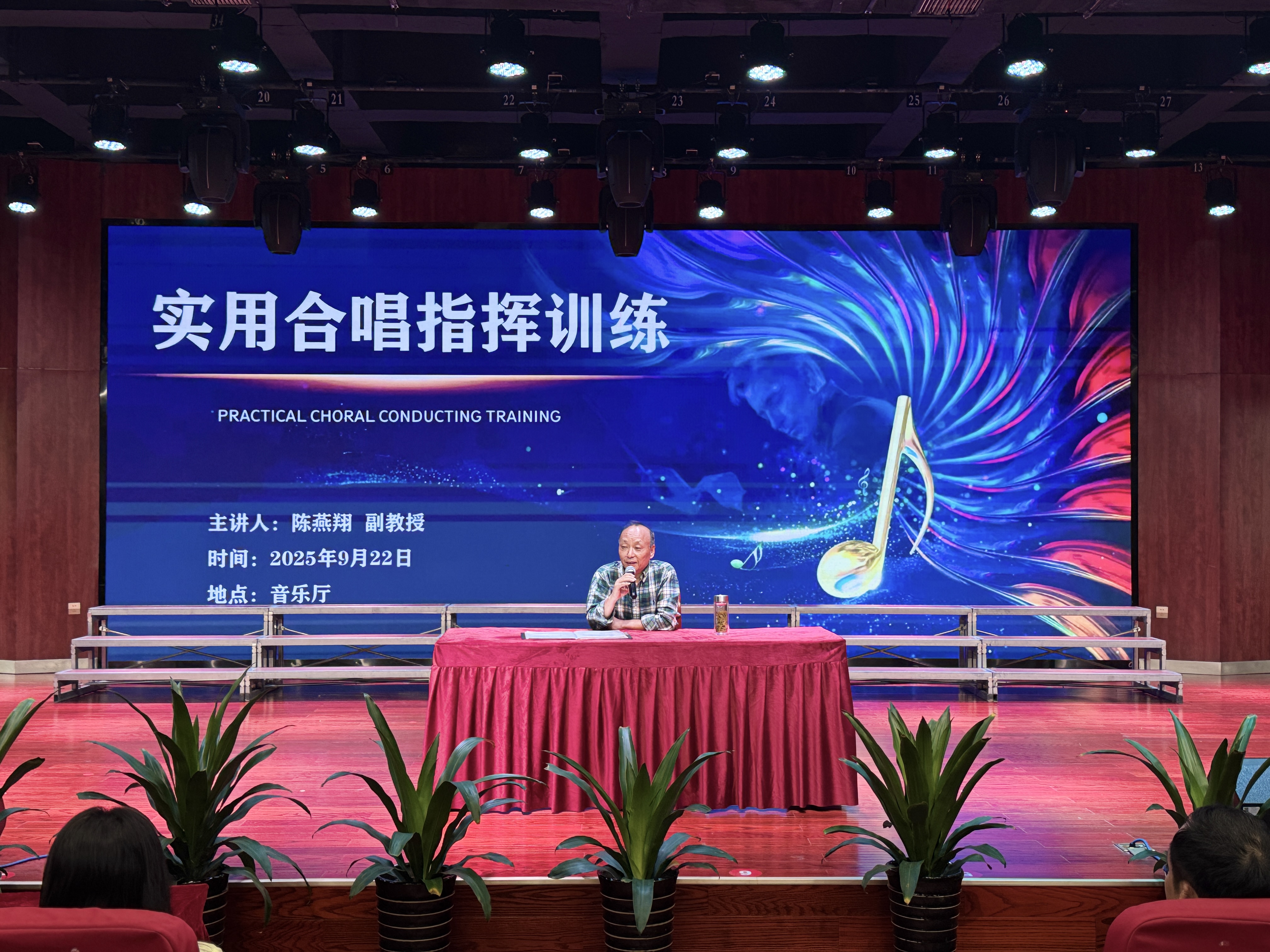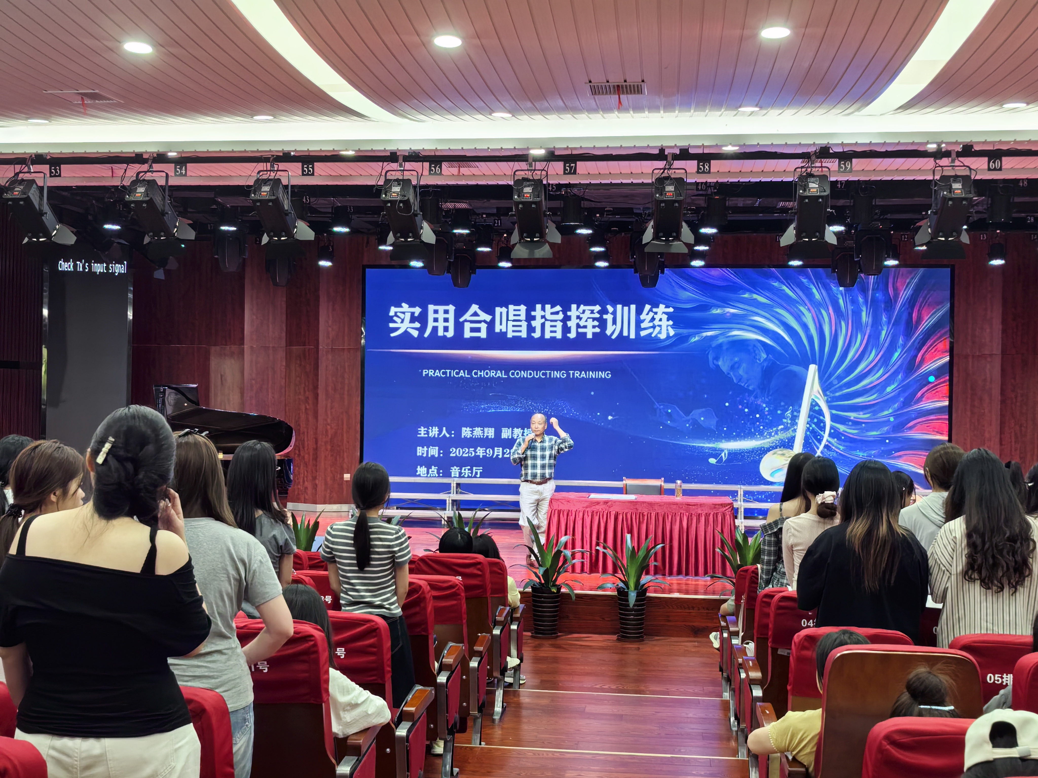 為提升我係師生的合唱與指揮專業技能,夯實合唱藝術實踐基礎,藝術與設計係於9月22日下午在校音樂廳成功舉辦“實用合唱與指揮訓練”講座。本次講座特邀安慶師範大學陳燕翔副教授擔任主講,係領導、專業教師、音樂專業學生以及校老年大學合唱班學員共200多人參與。