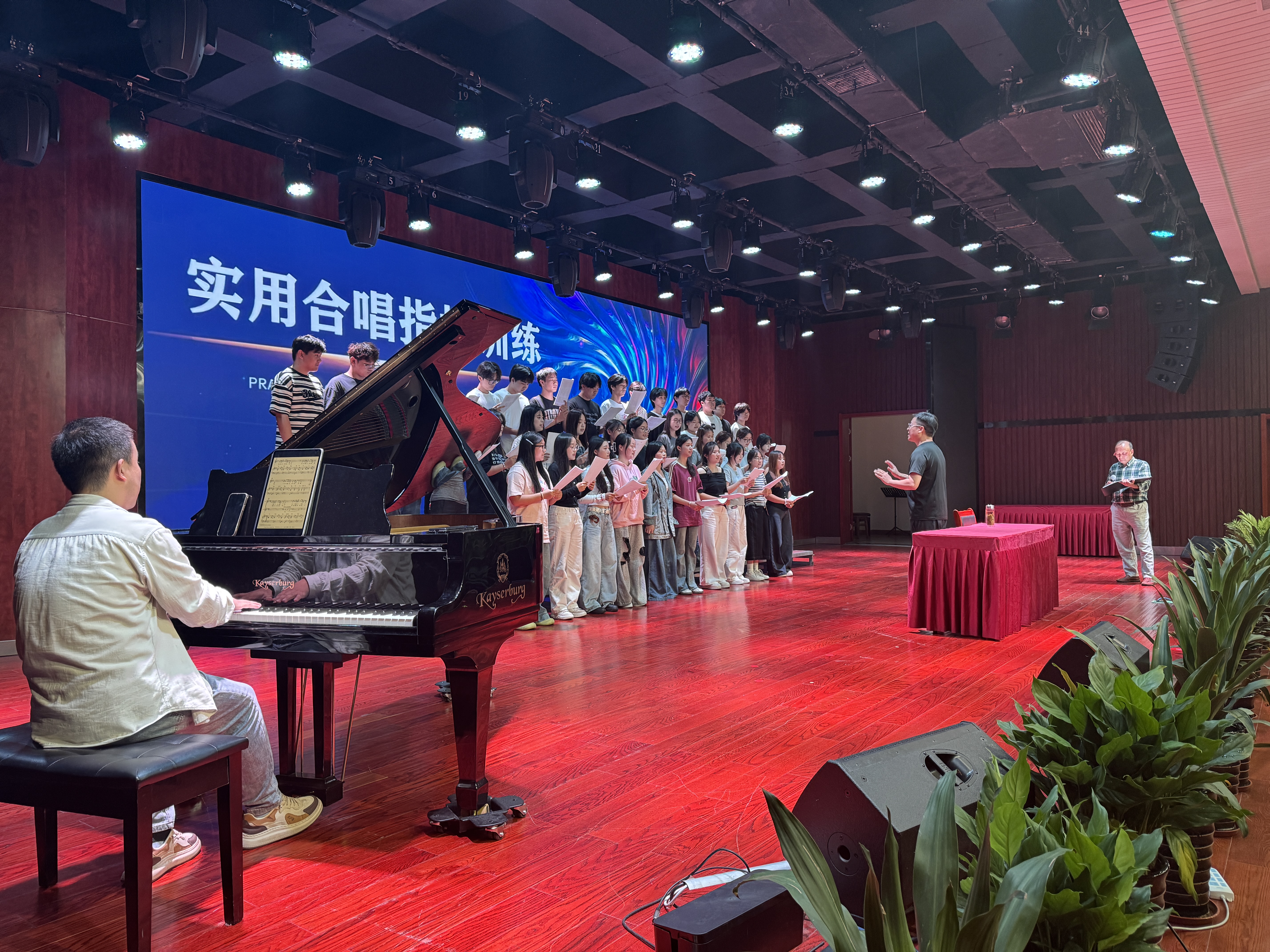最後,教授對我係學生合唱團進行指導。同學們熱情高漲,精神飽滿。從基礎的呼吸調控、聲音共鳴技巧,到複雜的聲部融合與情感表達,教授親自示範,逐一解析合唱訓練的核心要素,讓每一位同學都能近距離感受大師級指導的魅力,親手觸摸合唱藝術的靈魂。