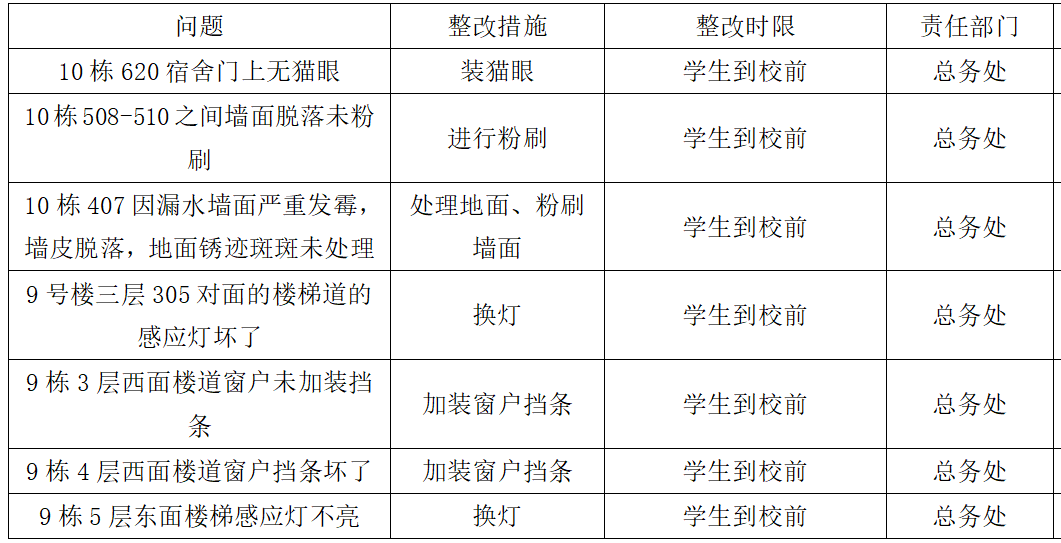 2、設施安全:仔細查看宿舍門窗、床鋪、桌椅、水電管線等基礎設施是否存在損壞,水龍頭、電器開關是否漏水漏電,確保硬件設施無安全隱患。