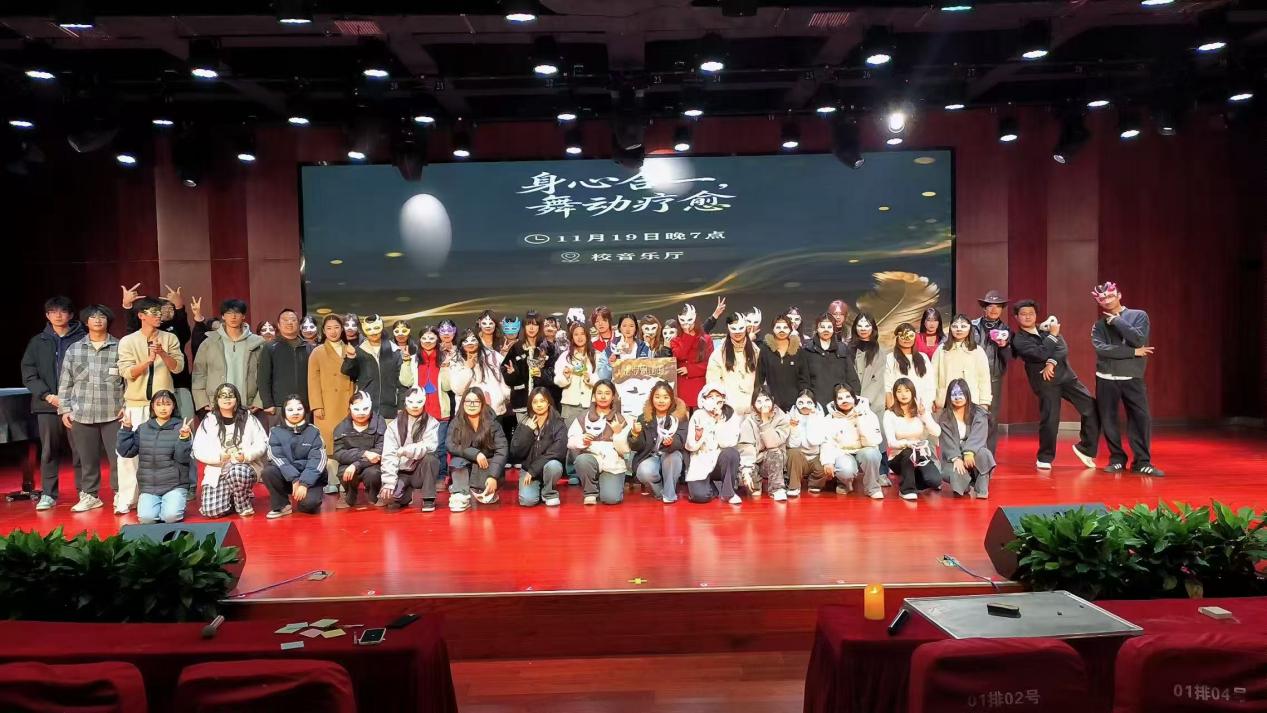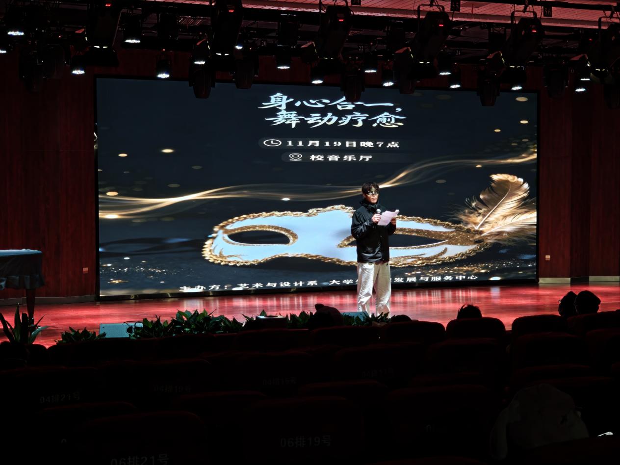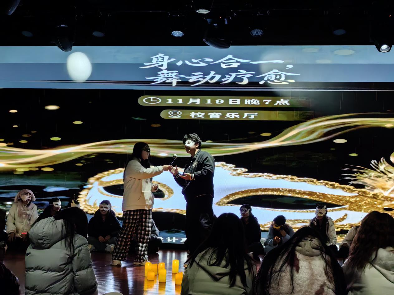 深化心理育人理念,豐富學生校園生活,全方位提升學生身心素養為幫助學生緩解社交壓力、實現身心放鬆,藝術與設計係於20251119日晚在音樂廳舉辦“身心合一·舞動療愈”假麵舞會活動,來自藝設係各年級各專業的46同學參與其中。