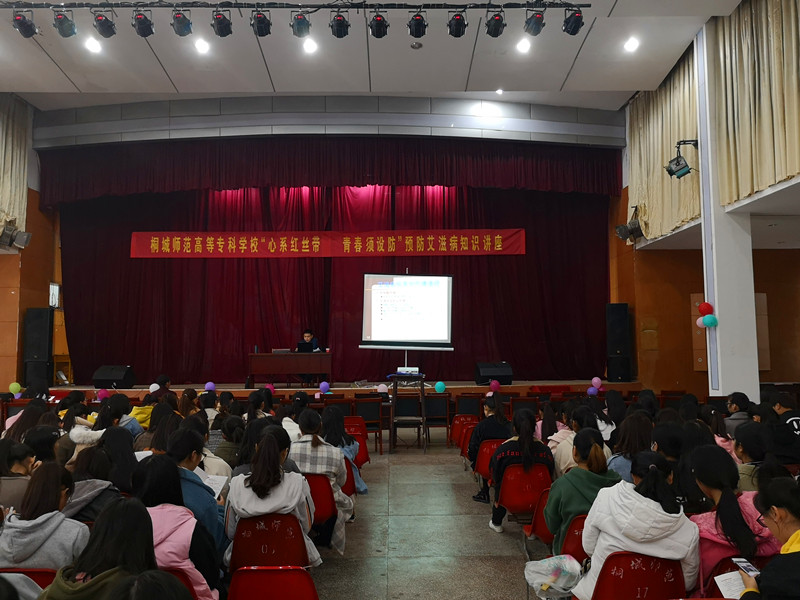 校醫室邀請市疾控中心專家來我校開展防艾專題講座,講座的主題為“心係紅絲帶,青春須設防”,並請桐城電視台對本次活動進行現場報道;製作了防艾宣傳標語,在校園主幹道進行了懸掛,以營造防艾氣氛;講座現場,誌願者給同學們發放宣傳手冊、宣傳畫冊及青年學生艾滋病知識問卷;組織學生在防艾宣傳標語橫幅上簽名;安排醫務人員現場接受學生谘詢;將防艾宣傳片在學校電子屏幕上進行循環播放;班級召開一次防艾主題班會等。