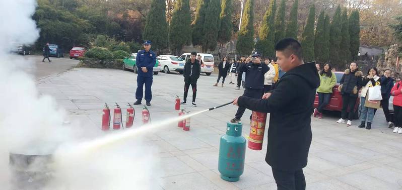 隨後,全體參加培訓的學生代表在三向學館門前廣場,在教官們的指導下現場學習使用滅火器材,進行了滅火演練實際操作。