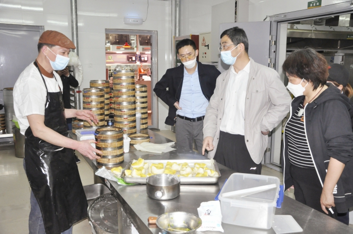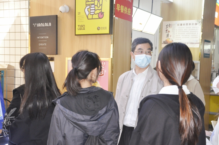 一走進食堂,沈波就來到前來就餐的同學們中間,詢問菜品的口感和價格,聽取同學們對食堂滿意度的意見和建議。沈波還走進後廚,詳細了解食堂菜品加工、麵點加工、烹飪操作間、售飯間等各個加工環節的衛生管理情況,對食堂加工環境衛生、餐具消毒、原材料儲存、食品留樣、采購和燃氣設備的規範使用等安全管理方麵工作落實情況進行了檢查。沈波叮囑食堂要落實好一周兩次的全員核酸檢測,工作中戴好口罩,遵守操作規程,注意用火用電用氣的安全。沈波還深入食堂冷庫,打開包裝箱,查看庫存食品批號、保質期等情況。沈波指出,當前全國各地疫情形勢嚴峻,學校疫情防控麵臨巨大挑戰,食堂要密切關注疫情形勢,采取積極有效應對舉措,重點做好物資儲備,尤其注意多儲存一些肉製食品,切實做好疫情期間的保供工作。![]()