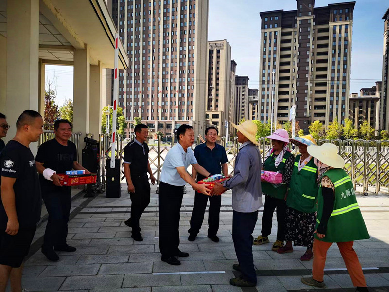 8月23日上午,正值高溫酷暑,學校黨委書記王子龍先後來到校大門口安保室、校園綠化現場、操場周邊護欄施工場地、學生公寓維修現場等走訪慰問暑期堅守在崗位上的一線後勤保障人員,並送上防暑降溫慰問品。黨委委員、副校長吳登明陪同慰問,總務處、保衛處等部門負責人參加。