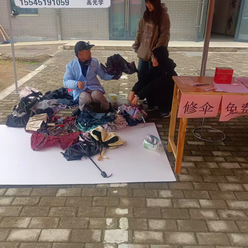 維修服務台前,同學們送來的問題雨傘堆成小山,師傅們憑借專業工具與豐富經驗,修剪彎折傘骨、更換破損傘布,讓130餘把雨傘重獲新生。小張同學小心翼翼地接過修好的碎花傘,眼中泛起淚光:“這把傘是奶奶送我的,用了四年多,兩根傘骨折了,我還以為修不好了,沒想到師傅連蕾絲花邊都修補得一模一樣,太感謝了!”