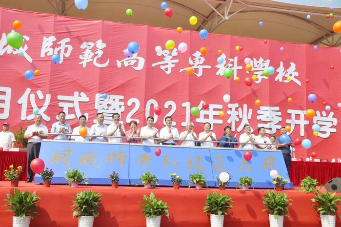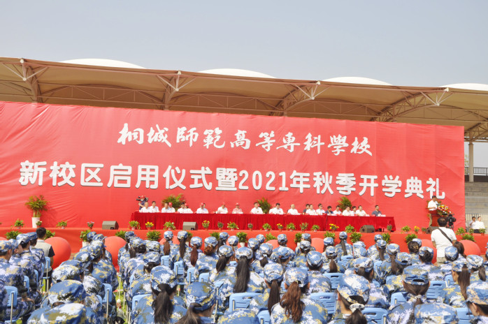 百年櫛風沐雨,一朝共賀新篇。9月27日上午,桐城師專隆重舉行新校區啟用儀式暨2021年秋季開學典禮。安慶市委常委、統戰部長陳明生,省教育廳二級巡視員湯仲勝,安慶市人大常委會副主任童學軍,安慶市政協副主席洪愛敏,桐城師專黨委書記王子龍,黨委副書記、校長沈波,安徽黃梅戲藝術職業學院黨委書記王穎迪,安慶市市人大常委會委員、教科文衛工委主任蘇長斌,安慶市教體局局長胡海生,桐城市委書記徐雄,桐城市長章周中,桐城市人大常委會主任江學潮,安慶醫藥高等專科學校黨委副書記張仕慶,安慶職業技術學院副院長譚維奇,安徽黃梅戲藝術職業學院黨委委員、辦公室主任、宣傳部長劉盛,安慶市高教工委四級調研員吳宗亞,桐城市東部新城建設領導小組辦公室主任付偉,桐城市政協副主席胡豔淩等領導和嘉賓出席儀式。校領導吳登明、程玉梅、王宏偉,學校全體師生參加儀式。